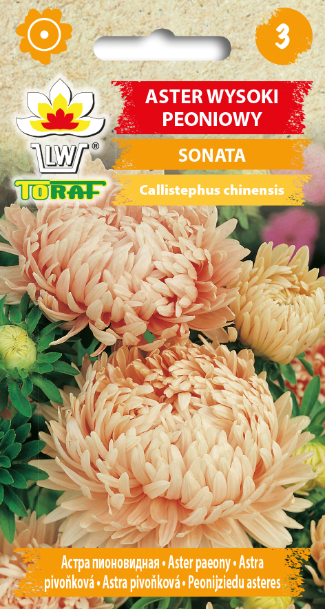 Aster wysoki peoniowy Sonata to roślina jednoroczna o czarujących pełnych prawie kulistych kwiatach w kolorze jasno łososiowym. Jasne brzoskwiniowo łososiowe kwiaty rozświetlą każdą rabatę tworząc piękną jasną chmurkę. Kwitnie przez całe lato i większą część jesieni. Średnica kwiatów 10-12 cm. Wysokość roślin do 50-75 cm.