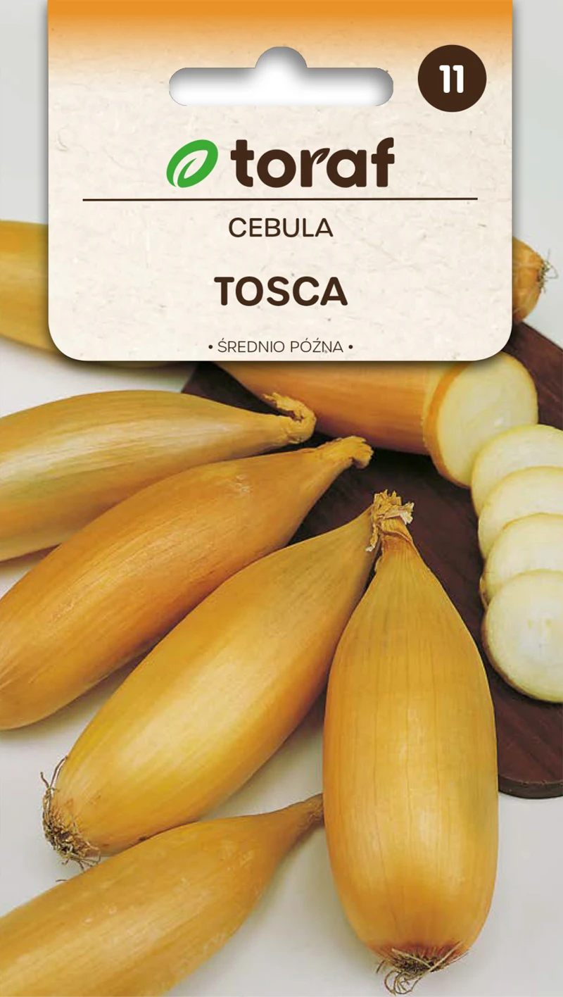 Cebula Tosca odmiana średnio późna do uprawy w gruncie i pod osłonami. Cebule o wadze 165g, mają charakterystyczny wydłużony kształt i jasno brązowy kolor łuski. Miąższ biały soczysty. Nadaje się do długiego przechowywania i bezpośredniej konsumpcji. Wymaga ziemi średnio ciężkiej, żyznej dobrze uprawionej.