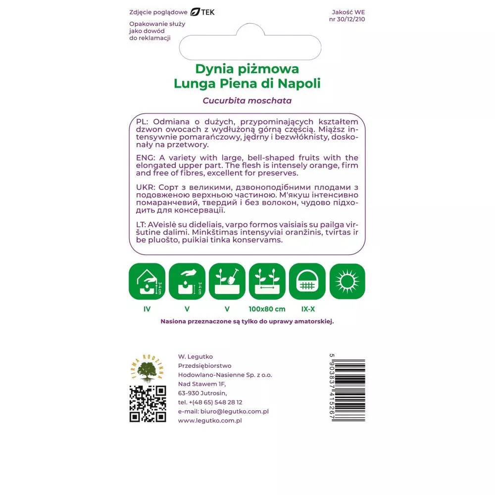 Dynia Lunga Piena Di Napoli jest dynią długo dojrzewającą, ważne aby nie przedłużać jej wysadzenia do gruntu ponieważ zbyt późno posadzona może nie zdążyć dojrzeć.