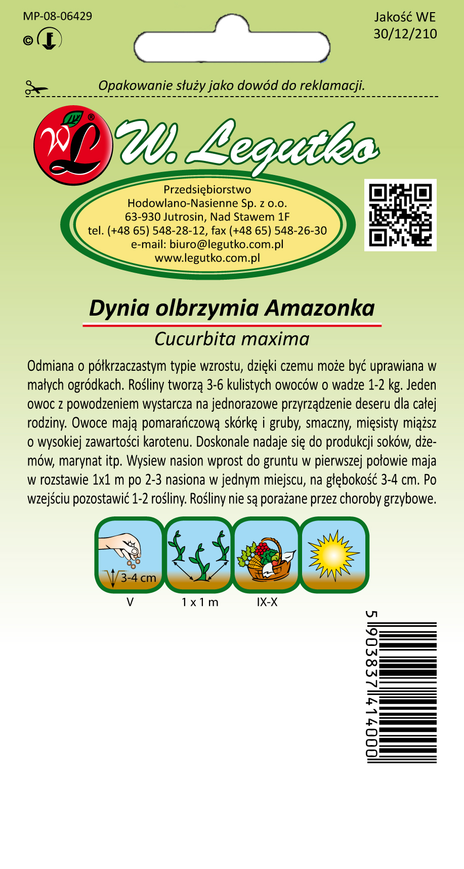 Dynia Amazonka to odmiana o półkrzaczastym typie wzrostu, dzięki czemu może być uprawiana w małych ogródkach. Rośliny tworzą 3-6 kulistych owoców o wadze 1-2 kg. Jeden owoc z powodzeniem wystarcza na jednorazowe przyrządzenie dania dla całej rodziny.