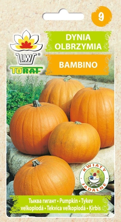 Dynia Olbrzymia Bambino to odmiana średnio-wczesna, dość plenna. Owoce kuliste, nieco spłaszczone, o ciężarze 15-50 kg o pomarańczowej delikatnej skórce. Miąższ ścisły, ciemnopomarańczowy o bardzo wysokiej zawartości witaminy A, co czyni ją szczególnie przydatną na przetwory dla dzieci.