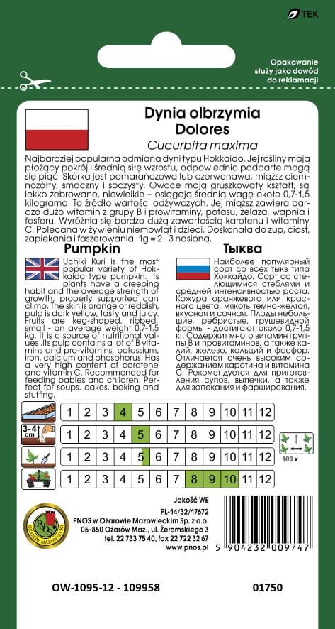 Dynia olbrzymia ‘DOLORES’ jest źródłem wartości odżywczych. Jej miąższ zawiera bardzo dużo witamin z grupy B, witaminy C, karotenu, prowitamin, potasu, żelaza, wapnia i fosforu. Doskonała do zup, ciast, zapiekania i faszerowania. Bardzo bobrze się przechowuje.