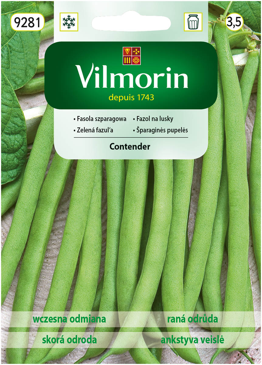 Cechy i zalety: Fasola Contender to odmiana karłowa, wczesna, bardzo plenna o długich, smacznych strąkach. Okres od siewu do zbioru wynosi ok 50 dni. Odporna na choroby. Charakteryzuje się długim okresem zbiorów.