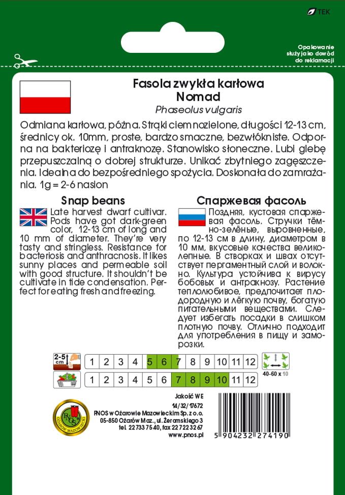 Fasola Nomad odmiana karłowa. O strąkach ciemnozielonych, długości 12-13cm, średnicy ok. 10mm, proste, bardzo smaczne. Odmiana przeznaczona do bezpośredniego spożycia i do przetwórstwa. Odporna na bakteriozę i antraknozę.