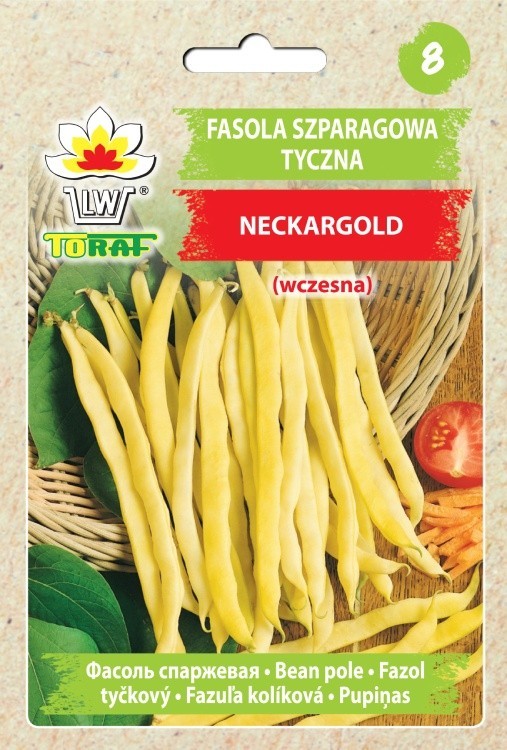 Fasola szparagowa tyczna Neckargold to odmiana tyczna żółtostrąkowa. Strąki długości 20-25 cm, okrągłe, mięsiste, bezłykowe. Nasiona białe, okrągłe. Zapewnia bardzo obfite zbiory.