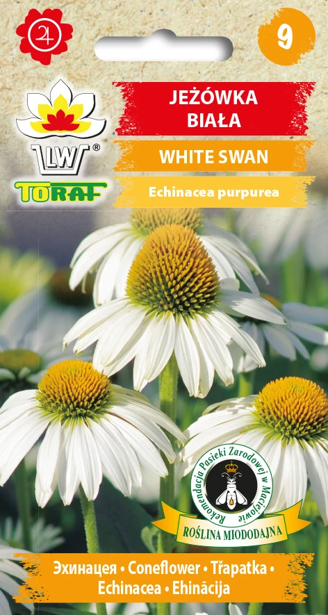 Jeżówka biała White Swan to chętnie odwiedzana przez motyle bylina o kwiatach z śnieżno-białymi płatkami i wypukłymi brązowymi środkami. Liście lancetowate, długie i szorstkie. Doskonała prezentuje się na preriowych kompozycjach, z trawami ozdobnymi, ogrodach naturalistycznych, wysokich rabatach bylinowych i obwódkach a także jako soliter. Najlepiej rośnie na stanowisku słonecznym w glebie dość żyznej i umiarkowanie wilgotnej. Korzeń, liście i kwiaty zawierają tonizujace substancje stymulujące organizm. Z kwiatów i liści można przygotować herbatę na przeziębienie.