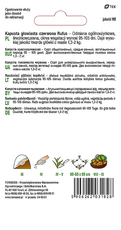 Kapusta głowiasta czerwona Rufus to odmiana ogólnoużytkowa, średnio wczesna, okres wegetacji wynosi 95-105 dni. Daje wysokiej jakości twarde, fioletowe z woskowym nalotem, odporne na pękanie główki o masie 1,3-2 kg.