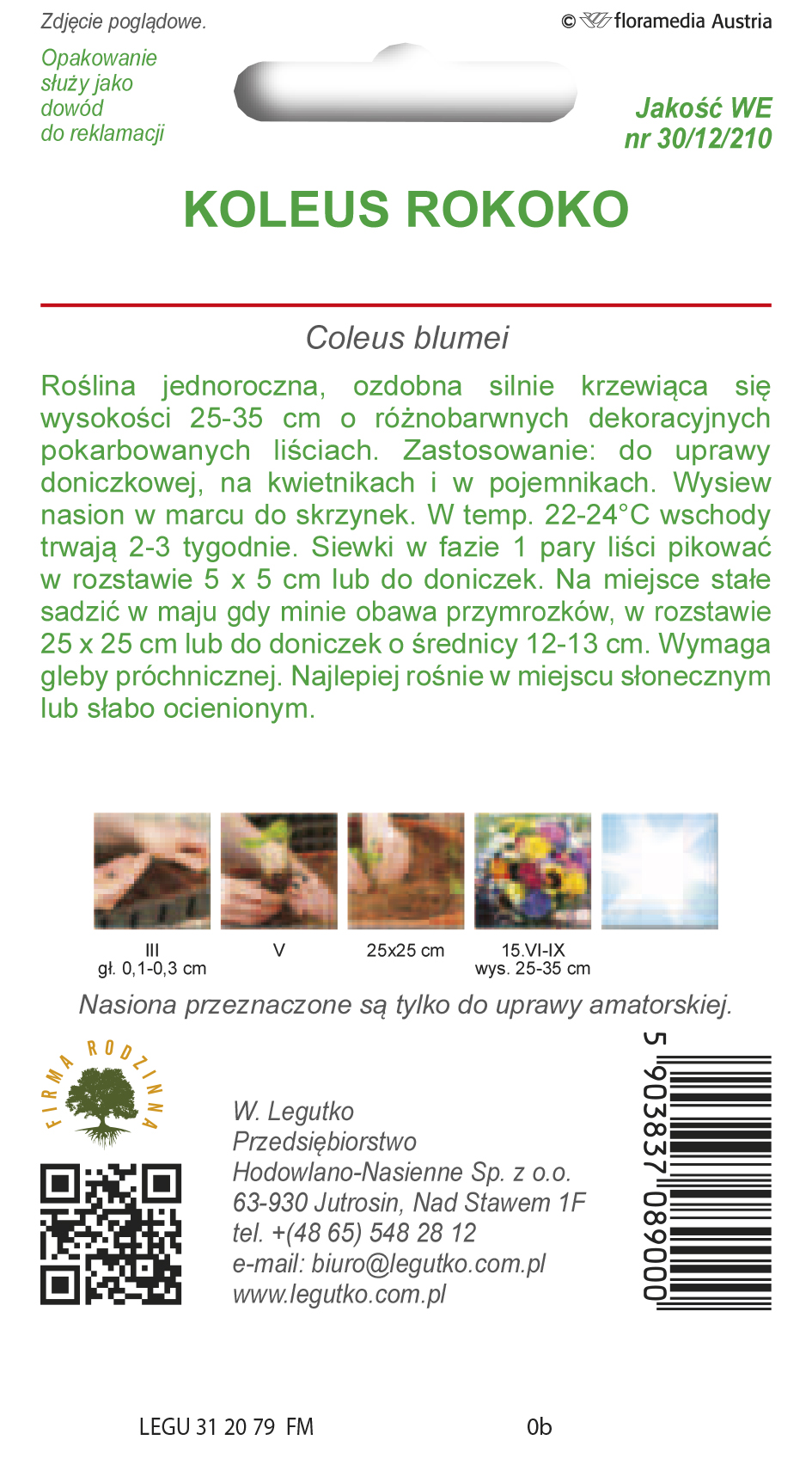 Koleus Blumego Rokoko to roślina ozdobna silnie krzewiąca się o wysokości 25-35 cm o różnobarwnych dekoracyjnych pokarbowanych liściach.