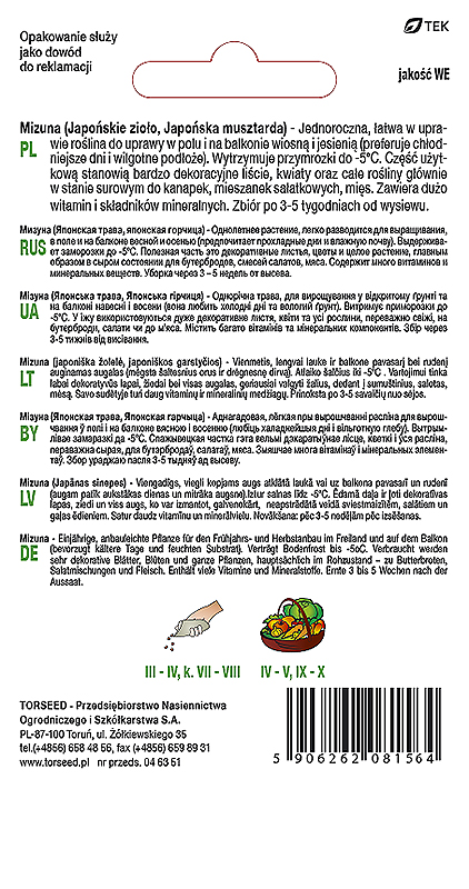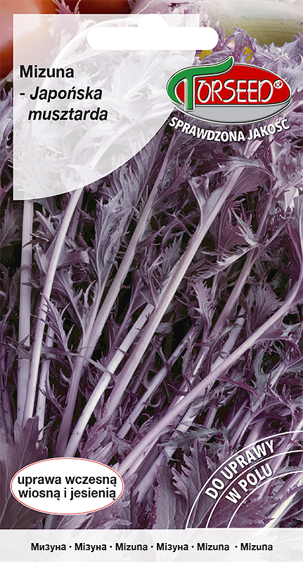 Mizuna Japońska czerwona to jednoroczna, łatwa w uprawie roślina do uprawy w polu i na balkonie wiosną i jesienią (preferuje chłodniejsze dni i wilgotne podłoże).Wytrzymuje przymrozki do -5oC. Część użytkową stanowią bardzo dekoracyjne liście, kwiaty oraz całe rośliny głównie w stanie surowym do kanapek, mieszanek sałatkowych, mięs. Zawiera dużo witamin i składników mineralnych.