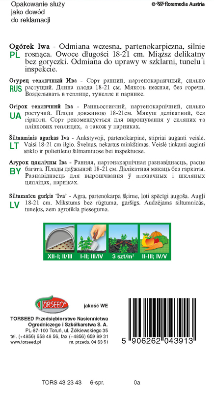 Ogórek Iwa to odmiana do uprawy w tunelach foliowych, szklarniach lub inspektach. Rośliny są partenokarpiczne, zawiązują owoce bez zapylania. Owoce długości 18-21 cm ciemnozielone, pozbawione goryczy.