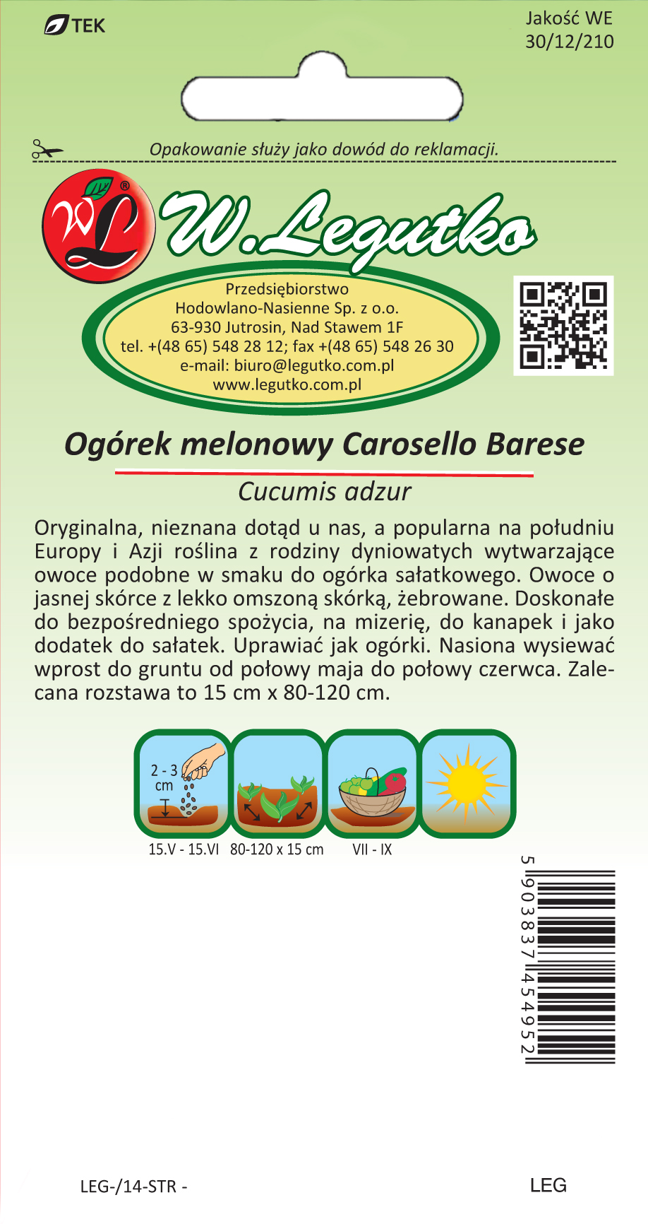 Ogórek melonowy Carosello Barese to oryginalna, nieznana dotąd u nas, a popularna na południu Europy i Azji roślina z rodziny dyniowatych wytwarzające owoce podobne w smaku do połączenia ogórka sałatkowego i melona. Owoce o jasnej skórce z lekko omszoną skórką, żebrowane, długości 10-15 cm z wyraźnym żebrowaniem. Długość zależy od miejsca uprawy. W tunelu, prowadzony na podporach będzie dłuższy, natomiast uprawiany w gruncie po ziemi będzie miał owoce nieco krótsze.