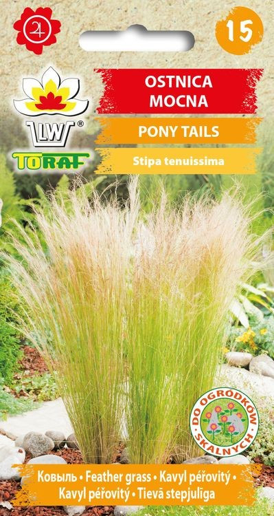 Ostnica Pony Tails to wieloletnia ozdobna trawa kępkowa osiągająca wysokość do 60 cm. Element dekoracyjny stanowią falujące na wietrze jaskrawozielone subtelne, nitkowate liście i delikatne puchowate kwiatostany. Doskonała roślina do kompozycji z innymi trawami ozdobnymi, na rabaty bylinowe i do pojemników. Zasuszone kwiatostany można stosować w suchych bukietach.