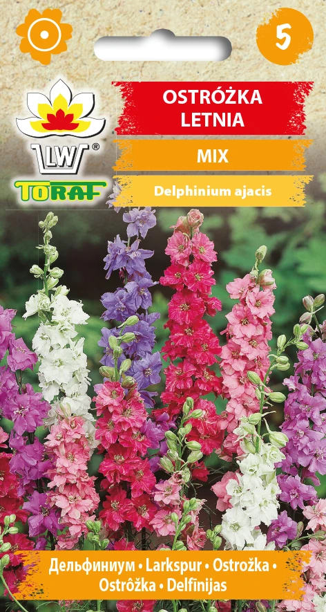 Ostróżka letnia to roślina jednoroczna, o kwiatach pełnych, zebranych w gęste grona, osiągająca wysokość do 100-150 cm. W skład mieszanki wchodzą rośliny o kwiatach w pięknych pastelowych kolorach białych, różowych, fioletowych i czerwonych. Doskonała jako tło dla innych roślin, do nasadzeń w grupach i na wyższe rabaty.