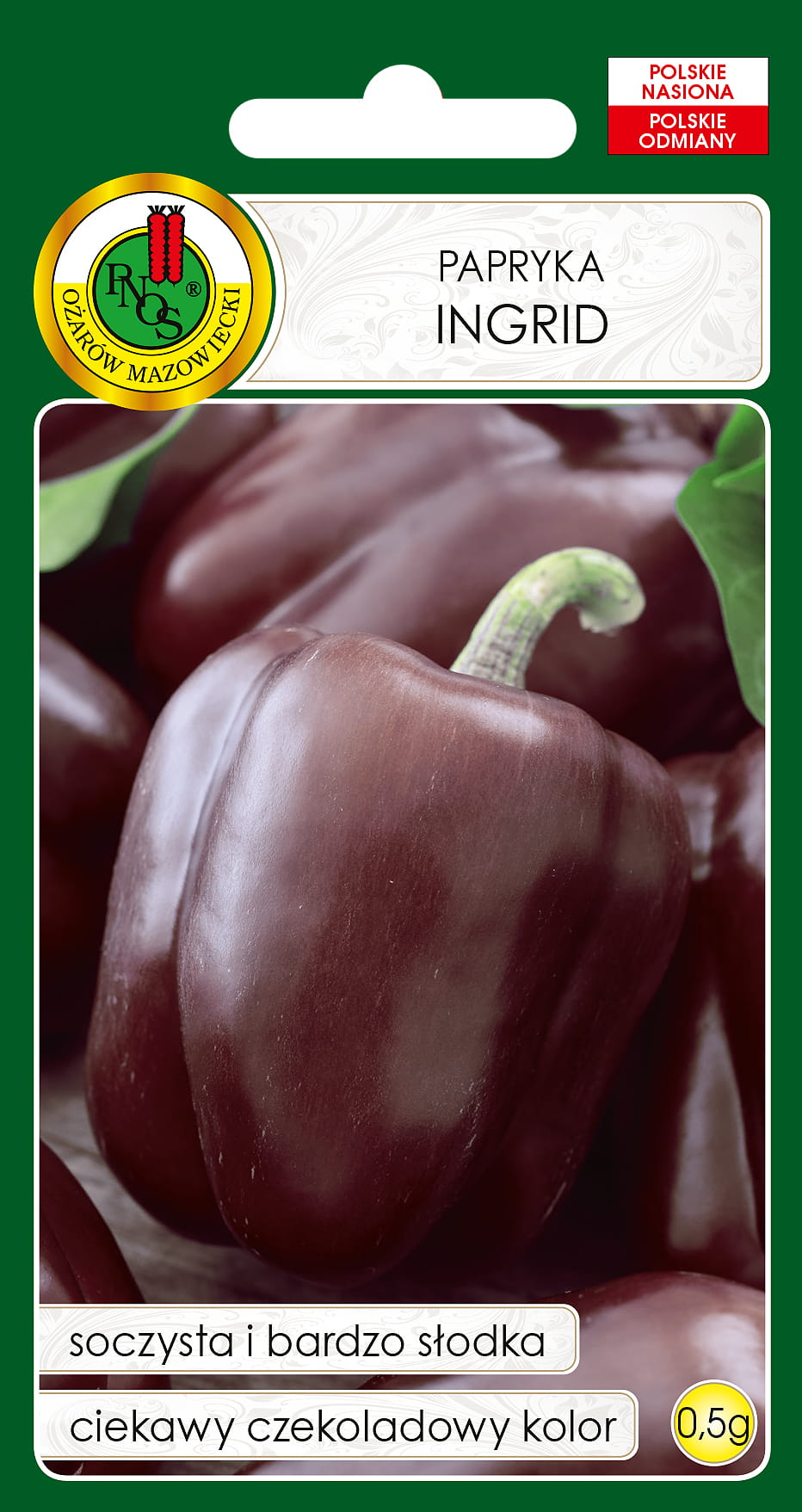 Papryka Ingrid to przepiękna, ciemnobrązowa odmiana słodkiej papryki. Wydaje duże, dochodzące do 200g owoce, lekko kwadratowe, w nietypowym, czekoladowym kolorze. Papryki są bardzo słodkie, soczyste i łagodne w smaku.