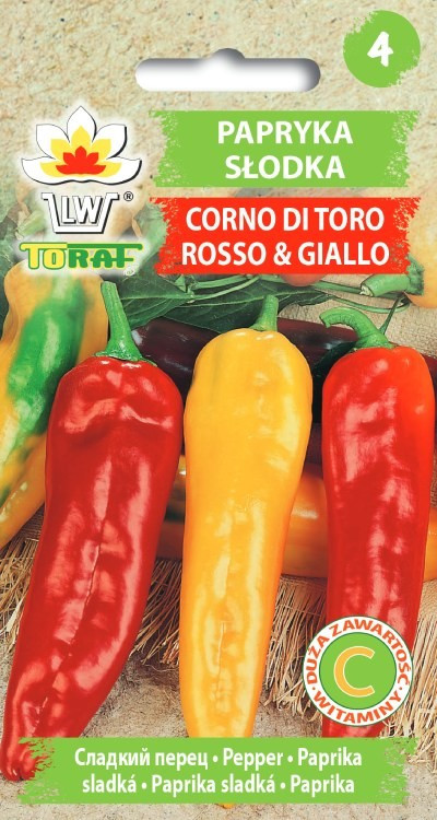 Papryka Corno di Toro Rosso & Giallo to mieszanka dwóch wczesnych odmian czerwonej i żółtej słodkiej papryki o podłużnych, stożkowatych owocach, zakrzywionych w kształcie rogu byka. Miąższ średnio gruby, soczysty, bardzo smaczny. Owoce o długości 18-20 cm mogą być także zbierane w fazie niepełnej dojrzałości, kiedy są zielone.