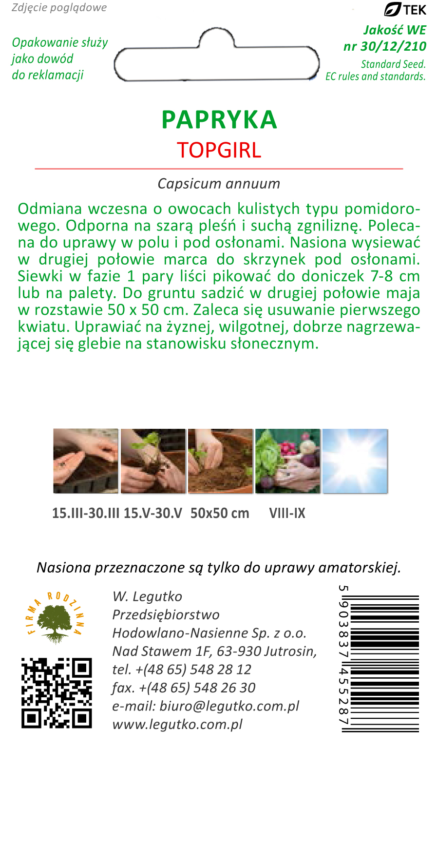 Papryka Topgirl to odmiana w typie papryki pomidorowej. Owoce kuliste, choć lekko spłaszczone od góry, niezbyt duże, ponieważ ważą mniej więcej po 80–90 g, mają jednak przy tym dosyć okazałe ścianki, które osiągają ok. 7 mm grubości. Odporna na szarą pleśń i suchą zgniliznę. Można ją uprawiać zarówno w polu, jak i pod osłonami, choć zauważa się, że w tym drugim wypadku sprawdza się nieco lepiej.