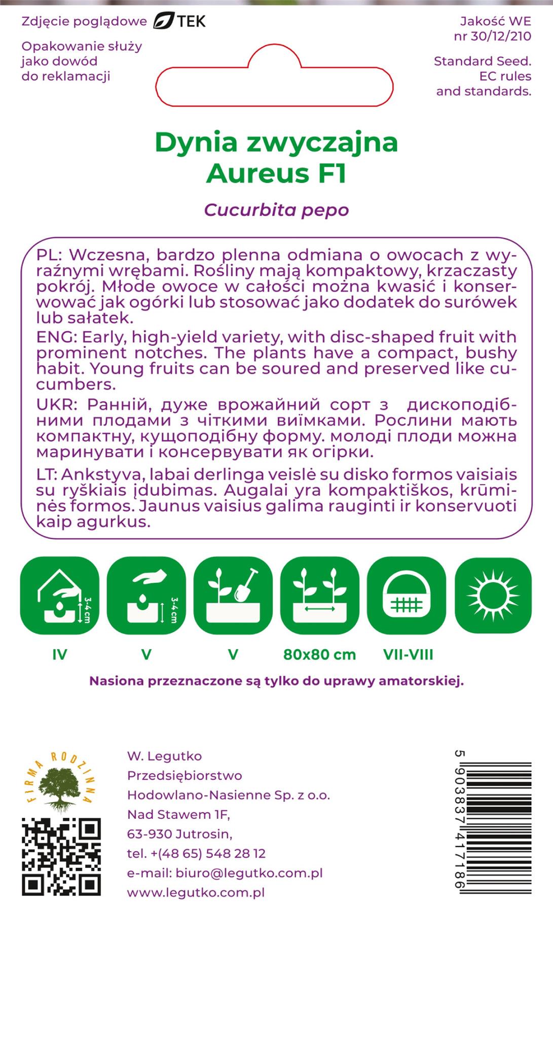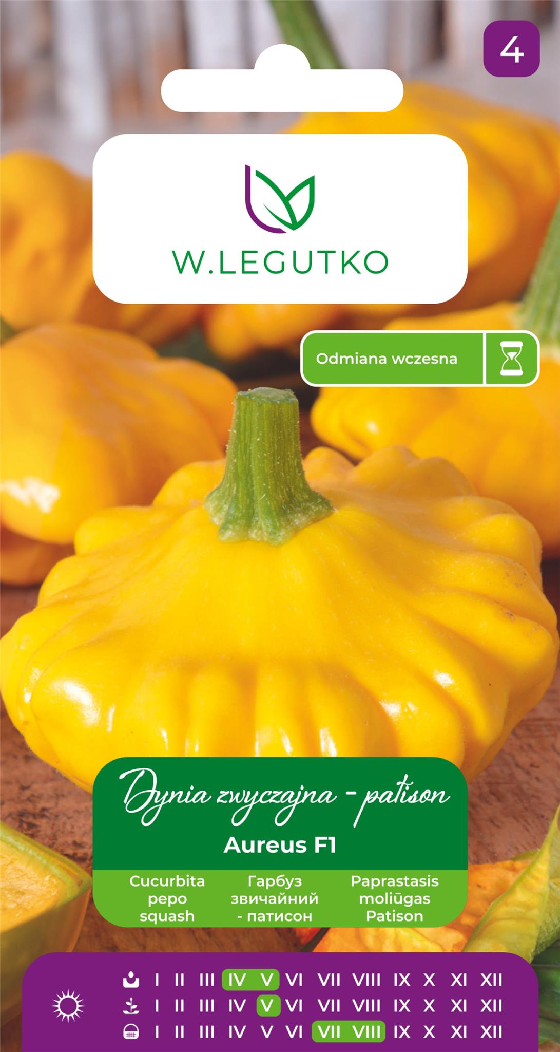 Patison Aureus żółty to wczesna, bardzo plenna odmiana o owocach z wyraźnymi wrębami. Rośliny mają kompaktowy, krzaczasty pokrój.