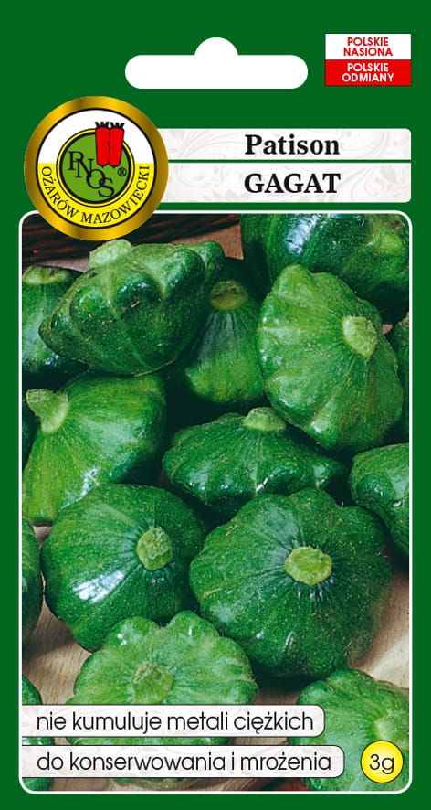 Patison Gagat to roślina o krzaczastym silnym wzroście, luźnym pokroju i ciemnozielonych owocach w kształcie dysku, ze słabo zaznaczonymi wrębami. Miąższ biały, soczysty, kruchy.