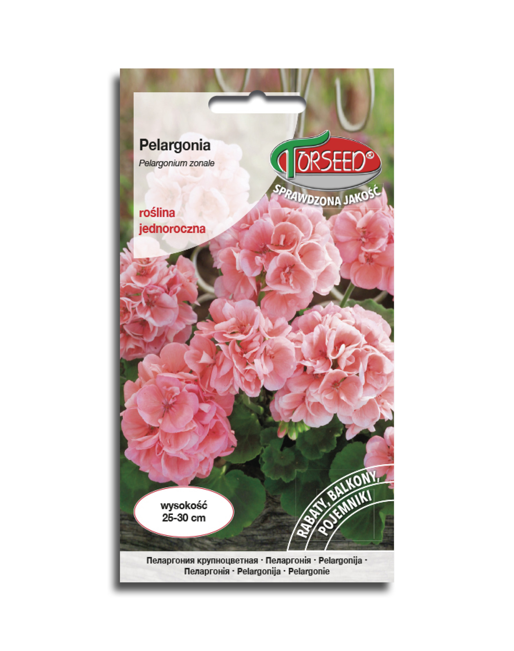 Pelargonia rabatowa łososiowa (Pelargonium zonale) to niezwykle dekoracyjna roślina o intensywnie łososiowych, dużych kwiatach zebranych w kuliste kwiatostany. Kwiaty pojawiają się od wiosny do jesieni, wypełniając rabaty, balkony i tarasy wyrazistym kolorem i elegancją. Liście są mięsiste, zielone z delikatnym wzorem, co tworzy ciekawy kontrast dla intensywnie barwnych kwiatów. Pelargonia ta jest rośliną bardzo odporną i łatwą w uprawie, dobrze znoszącą zarówno słońce, jak i okresowe przesuszenie.