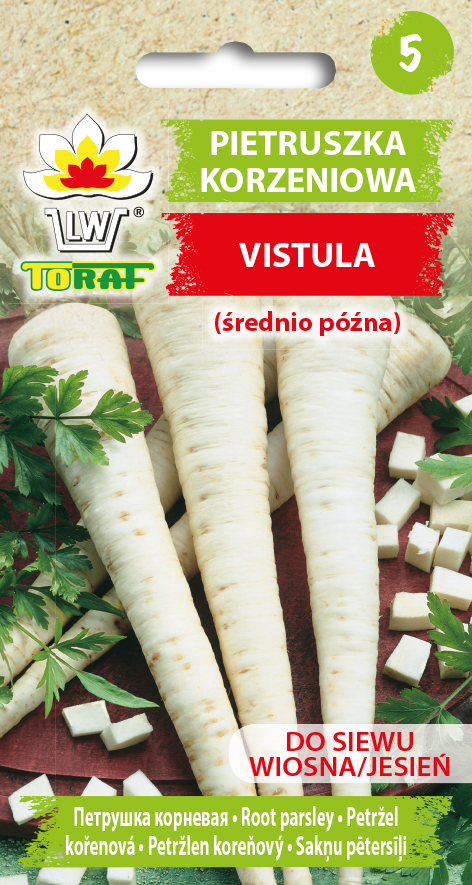 Pietruszka korzeniowa VISTULA to odmiana średnio późna w typie Berlińskiej. Korzenie długości 19-22 cm, stożkowato-wydłużone z białą skórką. Miąższ kremowy, jędrny, bardzo aromatyczny.
