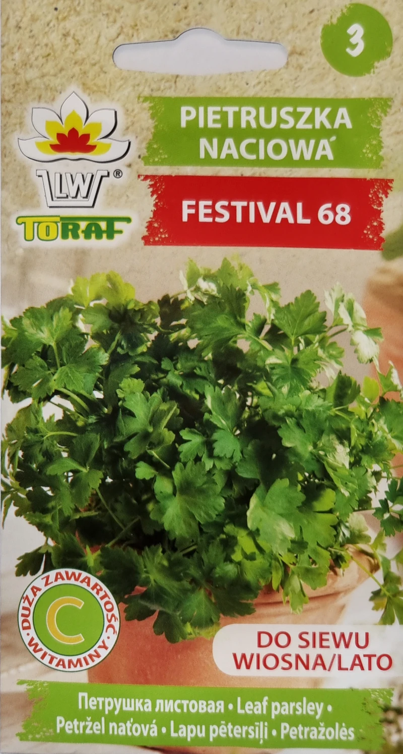 Pietruszka naciowa Festival 68 to odmiana plenna o aromatycznych intensywnie zielonych gładkich liściach. Niezwykle zasobna w witaminy A, C i B i sole mineralne. Odporna na żółknięcie i mączniaka prawdziwego. Odmiana dobrze zimuje w gruncie.