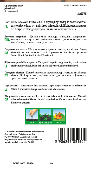 Pietruszka naciowa Festival 68 ma średni okres wegetacji ok. 70 – 80 dni od wysiewu do pierwszych liści. Jest dosyć wysoka co ułatwia zbiór. Obficie plonuje i szybko odrasta po zbiorze.