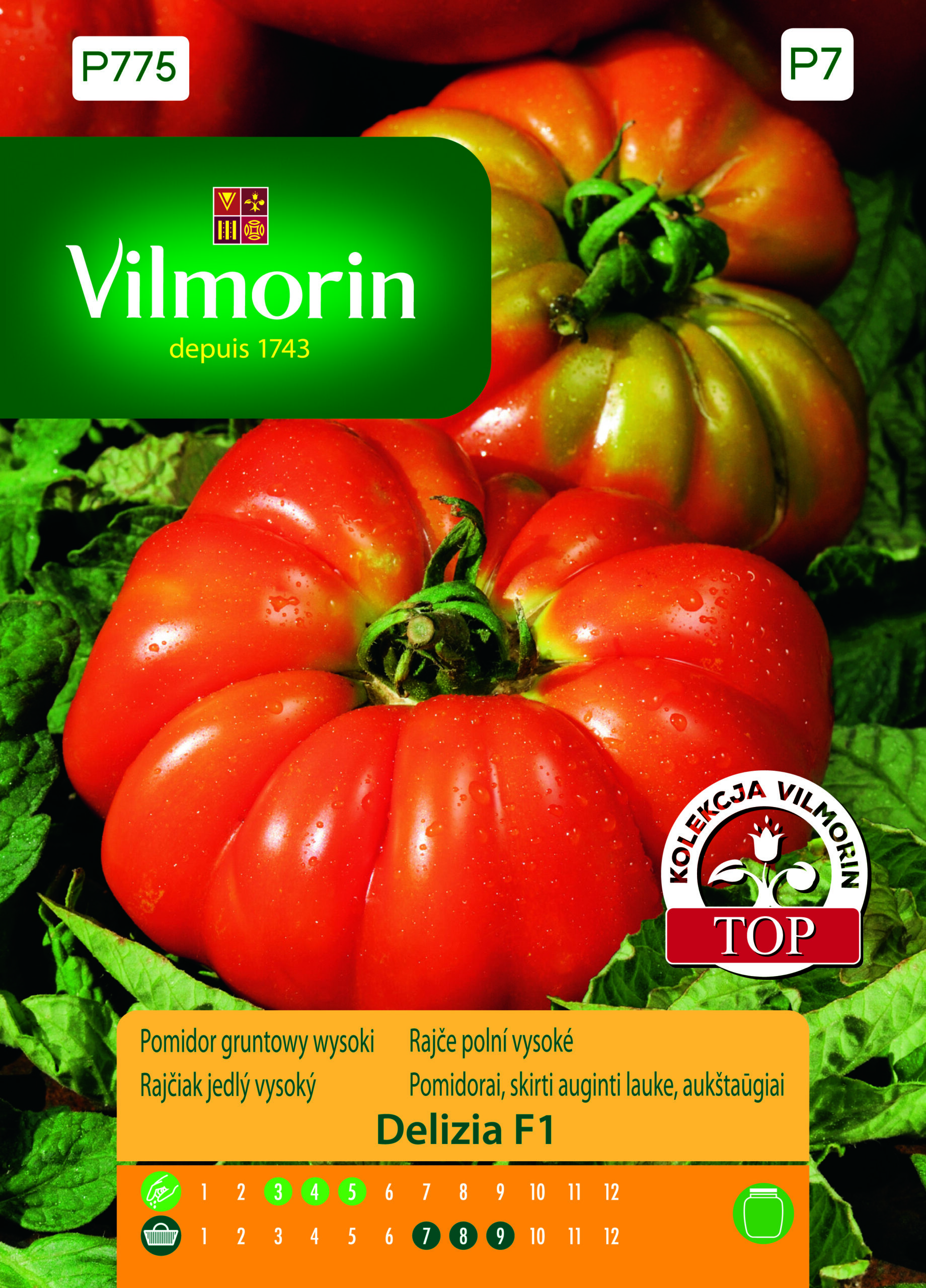 Cechy i zalety: Pomidor Delizia to odmiana wysoka, bardzo wczesna o żebrowanych owocach, czerwonych z lekkim zazielenieniem przy szypułce. Owoce ok 180g Wysoce odporny na wirusa mozaiki pomidora oraz na fuzariozę.