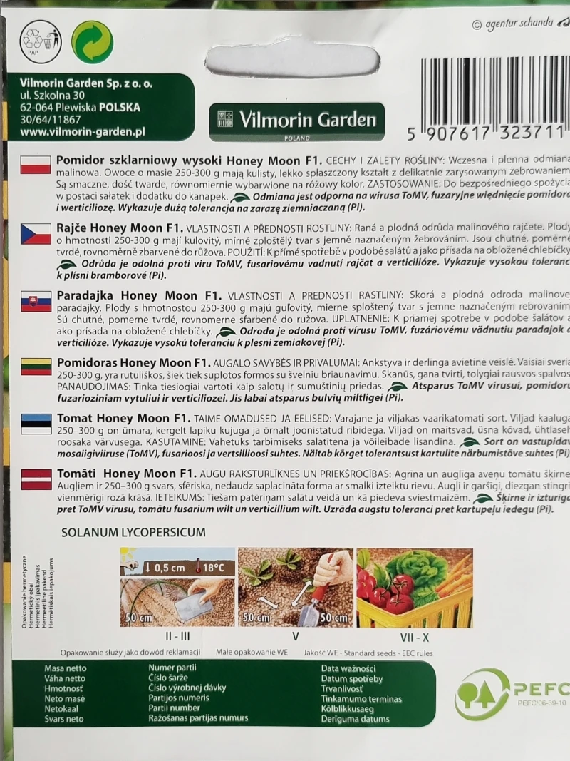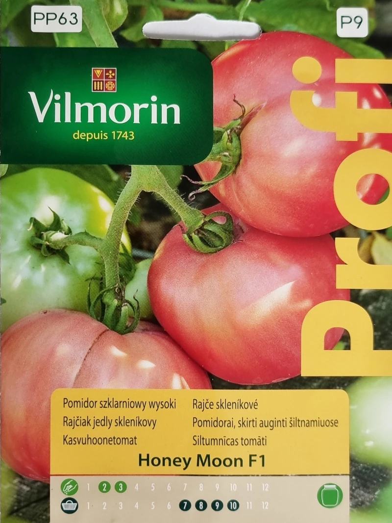 Cechy i zalety: Pomidor Honey Moon to wczesna i plenna odmiana malinowa. Owoce o masie 250 – 300 g mają kulisty, lekko spłaszczony kształt z delikatnie zarysowanym żebrowaniem. Są smaczne, dość twarde, równomiernie wybarwione na różowy kolor.