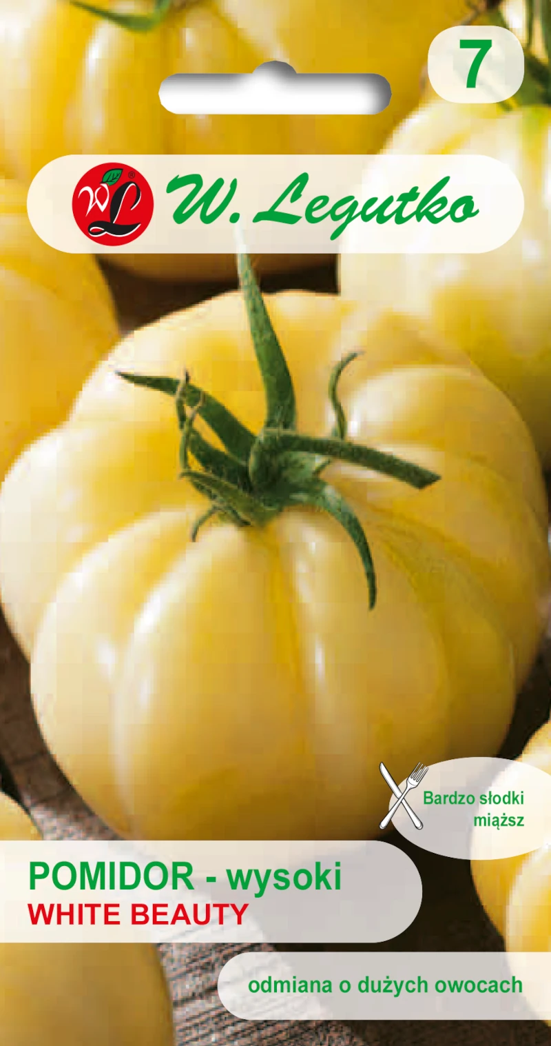 Pomidor White Beauty to interesująca odmiana o dużych, ok. 200 g, białych owocach. Miąższ mięsisty, białokremowy, bardzo słodki. Rośliny wysokie wymagają palikowania. Najlepiej prowadzić je na 1-2 pędy.