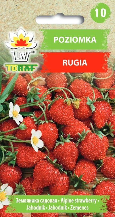 Poziomka Rugia to odmiana bezrozłogowa, powtarzająca, plenna, odporna na mróz. Owoce wydłużone, ostro zakończone, intensywnie czerwone, aromatyczne.
