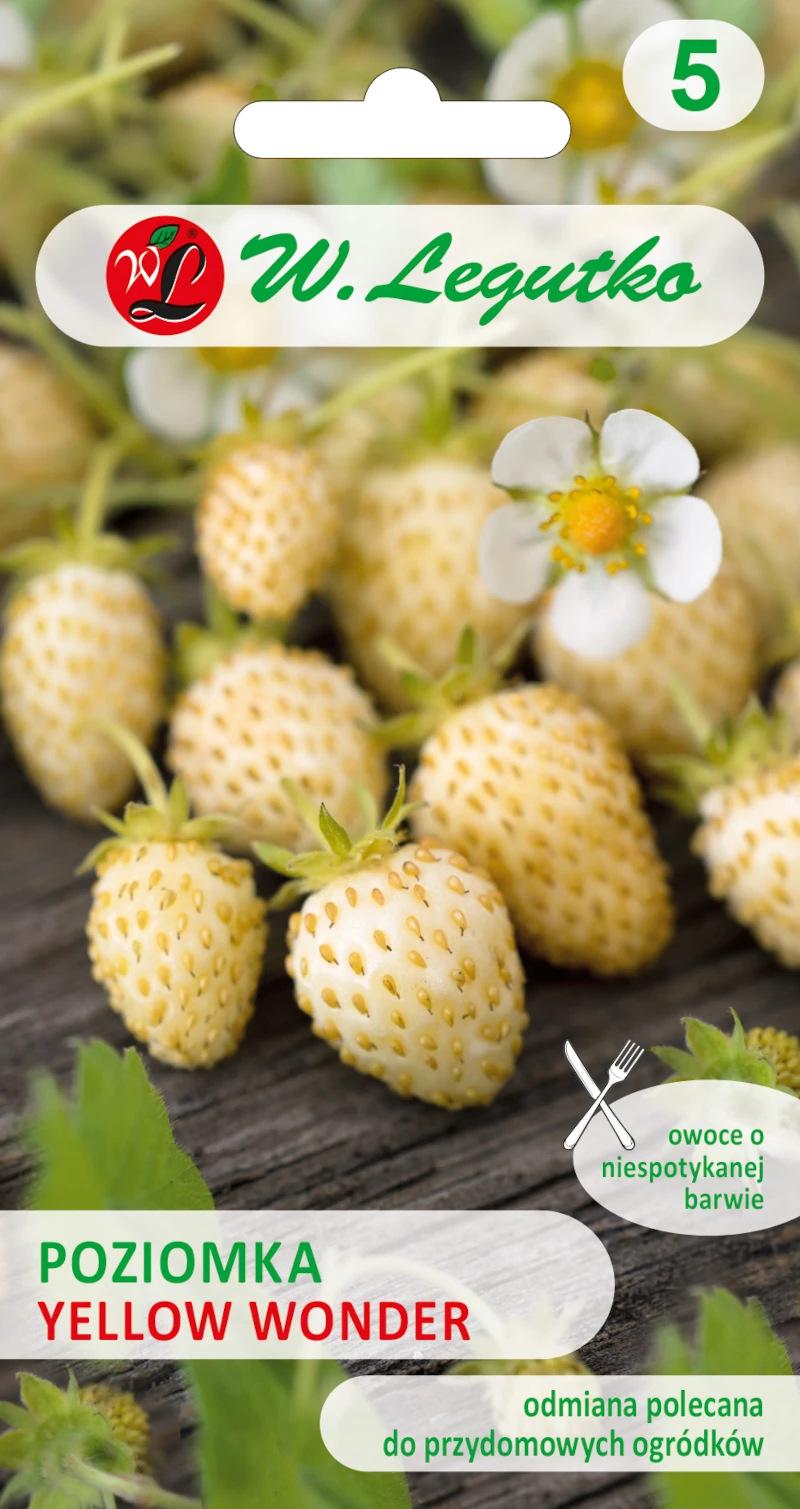 Poziomka Yellow Wonder to rośliny wysokości 15-20cm, tworzące wydłużone owoce o niespotykanej kremowożółtej barwie i żółtych nasionach. Wyjątkowe walory smakowe owoców oraz brak zainteresowania nimi przez ptaki, sprawiają, że jest to odmiana szczególnie polecana do przydomowych ogródków.