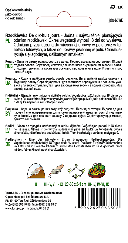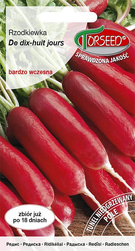 Rzodkiewka osiemnastodniowa De dix – huit jours to jedna z najwcześniej plonujących odmian rzodkiewek. Okres wegetacji wynosi tylko18 dni od wysiewu. Odmiana przeznaczona do wiosennej uprawy w polu oraz w tunelach foliowych, a także do uprawy jesiennej w polu.