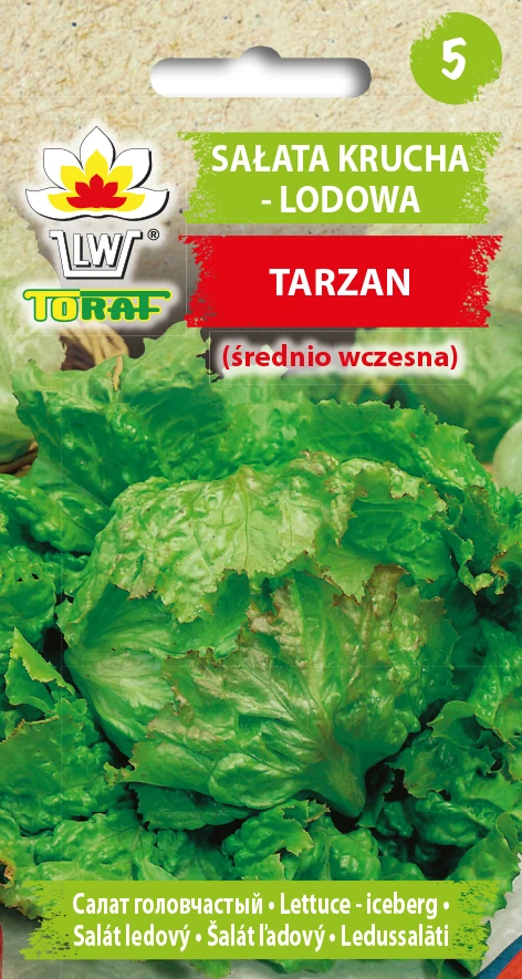 Sałata krucha lodowa Tarzan to odmiana średnio-wczesnej sałaty kruchej, okres wegetacji 80-90 dni, polecana do uprawy w gruncie. Tworzy duże lub bardzo duże, zwięzłe główki o masie powyżej 1kg, odporne na wybijanie w pędy kwiatostanowe. Liście są duże i kruche o powierzchni pęcherzykowatej i soczystej ciemnozielonej barwie oraz doskonałym smaku. Odmiana bardzo plenna.